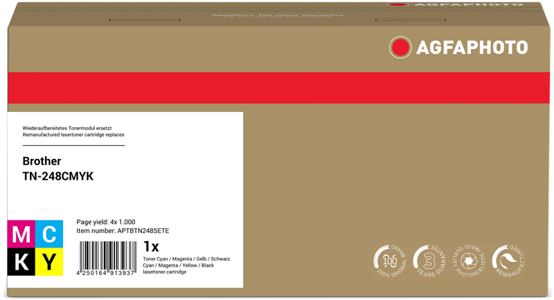 compatible with Brother TN-248CMYK Agfa Photo multipack black / cyan / magenta / yellow (APTBTN248SETE) multipack black / cyan / magenta / yellow ~4,000 pages €182.68-10%€164.93VAT incl., free shipping directly from stock Delivery time 1-2 days add to basket Content APTBTN248BE black ~1.000 pages 4.2 p / page APTBTN248CE cyan ~1.000 pages 4.1 p / page APTBTN248ME magenta ~1.000 pages 4.1 p / page APTBTN248YE yellow ~1.000 pages 4.1 p / page Product information "Agfa Photo multipack black / cyan / magenta / yellow"multipack black / cyan / magenta / yellow ~4,000 pages Read moreread lessSuitable for the following printersBrother DCP-LDCP-L3515CDWDCP-L3520CDWDCP-L3520CDWEDCP-L3555CDWDCP-L3560CDWBrother HL-LHL-L3215CWHL-L3220CWHL-L3220CWEHL-L3240CDWHL-L8230CDWHL-L8240CDWBrother MFC-LMFC-L3740CDWMFC-L3740CDWEMFC-L3760CDWMFC-L8340CDWMFC-L8390CDWManufacturer information on product safety (GPSR)Lupus Imaging & Media GmbH & Co. KGPilatuspool 220355 Hamburg E-mail: info@lupus-imaging-media.com Website: https://www.agfaphoto.com/ Suitable accessories for your printer Original Brother TN-248BK black tonercolourTape Width Size colour: Page number:~1,000 pagesPage price:6.0 p / page€60.27VAT incl., plus shipping costs directly from stock add to basket directly from stock add to basket directly from stock add to basket directly from stock add to basket directly from stock add to basket directly from stock add to basket directly from stock add to basket directly from stock add to basket directly from stock add to basket directly from stock add to basket directly from stock add to basket directly from stock add to basket directly from stock add to basket directly from stock add to basket directly from stock add to basket directly from stock add to basket Price / performance winner compatible with Brother TN-248BK Prindo Classic black tonercolourTape Width Size colour: Page number:~1,000 pagesPage price:3.6 p / page€36.30VAT incl., plus shipping costs directly from stock add to basket directly from stock add to basket directly from stock add to basket directly from stock add to basket directly from stock add to basket directly from stock add to basket directly from stock add to basket directly from stock add to basket directly from stock add to basket directly from stock add to basket directly from stock add to basket directly from stock add to basket directly from stock add to basket directly from stock add to basket directly from stock add to basket directly from stock add to basket Delivery date unknown add to basket Original Brother toner for your printer. Brother TN-248BK black tonercolourTape Width Size:Standard colour: Page number:~1,000 pagesPage price:6.0 p / page€60.27VAT incl., plus shipping costs directly from stock add to basket Brother TN-249BK black tonercolourTape Width Size:Standard colour: Page number:~4,500 pagesPage price:2.7 p / page€120.71VAT incl., free shipping directly from stock add to basket Brother TN-248XLBK black tonercolourTape Width Size:XL colour: Page number:~3,000 pagesPage price:3.4 p / page€101.57VAT incl., free shipping directly from stock add to basket Brother TN-248 MCVP black / cyan / magenta / yellow / White value pack (+ Prindo Universal Papier 2500 Blatt)colourTape Width Size:Standard colour: Page number:~4,000 pagesPage price:6.0 p / page€283.74-15%€241.63VAT incl., free shipping directly from stock add to basket Brother TN-249 MCVP black / cyan / magenta / yellow / White value pack (+ Prindo Universal Papier 2500 Blatt)colourTape Width Size:Standard colour: Page number:~16,500 pagesPage price:4.3 p / page€705.48VAT incl., free shipping directly from stock add to basket Brother TN-248XL MCVP black / cyan / magenta / yellow / White value pack (+ Prindo Universal Papier 2500 Blatt)colourTape Width Size:XL colour: Page number:~9,900 pagesPage price:4.9 p / page€480.19VAT incl., free shipping directly from stock add to basket Brother TN-248C cyan tonercolourTape Width Size:Standard colour: Page number:~1,000 pagesPage price:6.5 p / page€64.77VAT incl., plus shipping costs directly from stock add to basket Brother TN-249C cyan tonercolourTape Width Size:Standard colour: Page number:~4,000 pagesPage price:4.7 p / page€189.21VAT incl., free shipping directly from stock add to basket Brother TN-248XLC cyan tonercolourTape Width Size:XL colour: Page number:~2,300 pagesPage price:5.2 p / page€119.95VAT incl., free shipping directly from stock add to basket Brother TN-248M magenta tonercolourTape Width Size:Standard colour: Page number:~1,000 pagesPage price:6.5 p / page€64.77VAT incl., plus shipping costs directly from stock add to basket Brother TN-249M magenta tonercolourTape Width Size:Standard colour: Page number:~4,000 pagesPage price:4.7 p / page€189.21VAT incl., free shipping directly from stock add to basket Brother TN-248XLM magenta tonercolourTape Width Size:XL colour: Page number:~2,300 pagesPage price:5.1 p / page€117.67VAT incl., free shipping directly from stock add to basket Brother TN-248Y yellow tonercolourTape Width Size:Standard colour: Page number:~1,000 pagesPage price:6.5 p / page€64.77VAT incl., plus shipping costs directly from stock add to basket Brother TN-249Y yellow tonercolourTape Width Size:Standard colour: Page number:~4,000 pagesPage price:4.7 p / page€189.21VAT incl., free shipping directly from stock add to basket Brother TN-248XLY yellow tonercolourTape Width Size:XL colour: Page number:~2,300 pagesPage price:5.2 p / page€119.95VAT incl., free shipping directly from stock add to basket Brother TN-248CMYK multipack black / cyan / magenta / yellow (CI75170)colourTape Width Size:Standard colour: Page number:~4,000 pagesPage price:5.4 p / page€254.58-15%€215.88VAT incl., free shipping directly from stock add to basket Our price / performance winners Compatible Prindo Classic toner for your printer.✅ Level indicator ✅ More printing performance ✅ 5-year warranty ✅ No loss of warranty for you