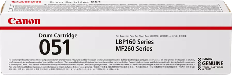Canon 051drum imaging drum black (2170C001) (051drum) Canon 051 Drum Cartridge, 23000 pages, Black, 1 pc(s) ~23,000 pages €97.46VAT incl., free shipping directly from stock Delivery time 1-2 days add to basket Product information "Canon 051drum imaging drum black"imaging drum black ~23,000 pages Canon 051 Drum Cartridge, 23000 pages, Black, 1 pc(s) Read moreread lessSuitable for the following printersCanon i-SENSYS LBPi-SENSYS LBP 162dwCanon i-SENSYS MFi-SENSYS MF 264dwi-SENSYS MF 264dw IIi-SENSYS MF 267dwi-SENSYS MF 267dw IIi-SENSYS MF 269dwtechnical dataTechnical detailsHarmonized System (HS) code84439990FeaturesCartridge return & recyclingYesProduct colour BlackOEM code2170C001Black toner page yield23000 pagesQuantity per pack1 pc(s)Compatibilityi-SENSYS LBP162dw i-SENSYS MF264dw i-SENSYS MF267dw i-SENSYS MF269dwBrand compatibilityCanonPrinting colours BlackTypeOriginalWeight & dimensionsPackage typeBoxAll details without engagement. Data source: IceCatManufacturer information on product safety (GPSR)Canon Europa N.V.Bovenkerkerweg 591185 XB Amstelveen Website: www.canon-europe.com Suitable accessories for your printer Original Canon 051h black toner (2169C002)colourTape Width Size colour: Page number:~4,100 pagesPage price:2.7 p / page€112.46VAT incl., free shipping directly from stock add to basket Delivery date unknown add to basket Original Canon toner for your printer. Canon 051 black toner (2168C002)colourTape Width Size:Standard colour: Page number:~1,700 pagesPage price:4.7 p / page€79.47VAT incl., plus shipping costs Delivery date unknown add to basket Canon 051h black toner (2169C002)colourTape Width Size:XL colour: Page number:~4,100 pagesPage price:2.7 p / page€112.46VAT incl., free shipping directly from stock add to basket Your product is right in your shopping cart! Select your printer to make sure the selected product fits for you.Loading...