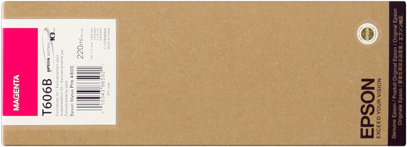 Epson T606B magenta ink cartridge (C13T606B00) (C13T606B00) ink cartridge magenta 220ml €134.23VAT incl., free shipping directly from stock Delivery time 1-2 days add to basket T6061 Black (photo) 220ml €134.66 T6067 lightblack 220ml €133.20 T6069 lightlightblack 220ml €134.66 T6062 cyan 220ml €134.66 T6065 cyan (light) 220ml €131.73 T606B magenta 220ml €134.23 T606C magenta (light) 220ml €134.23 T6064 yellow 220ml €133.20 Product information "Epson T606B magenta ink cartridge C13T606B00"Epson's ink has been specifically designed to work with your Epson printer. For the best printing results, make sure you use only genuine Epson printer inks. When you depend on quality printed material you can rely on original Epson ink supplies to give you great results every time. Whatever Epson printer you have, you’ll find the right ink supplies you need for it here. Read moreread lessSuitable for the following printersEpson Stylus ProStylus Pro 4800technical dataLogistics dataProducts per pallet layer (UK)192 pc(s)Products per pallet layer144 pc(s)Products per pallet (UK)1920 pc(s)Pallet height (UK)1830 mmPallet length (UK)1200 mmPallet width (UK)1000 mmQuantity per master carton24 pc(s)Master (outer) case height183 mmMaster (outer) case length443 mmMaster (outer) case width293 mmPallet height1830 mmPallet length1200 mmPallet width800 mmPackaging contentQuantity per pack1 pc(s)Technical detailsCountry of originChinaFeaturesColourYesPrint technologyInkjetPrinting colours MagentaQuantity1Compatible productsStylus Pro 4800Capacity220 mlOEM codeC13T606B00Ink typePigment-based inkOriginalYesColour ink volume220 mlquantity of coloured inks 1MultipackNoCompatibilityStylus Pro 4800Brand compatibilityEpsonTypeOriginalPackaging dataPackage typeProducts per pallet1440 pc(s)Package weight0.43 gPackage height110 mmPackage depth290 mmPackage width30 mmAll details without engagement. Data source: IceCatManufacturer information on product safety (GPSR)Epson Deutschland GmbHSchiessstraße 4940549 Düsseldorf E-mail: info@epson.de Website: https://www.epson.de/de_DE Your product is right in your shopping cart! Select your printer to make sure the selected product fits for you.Loading...