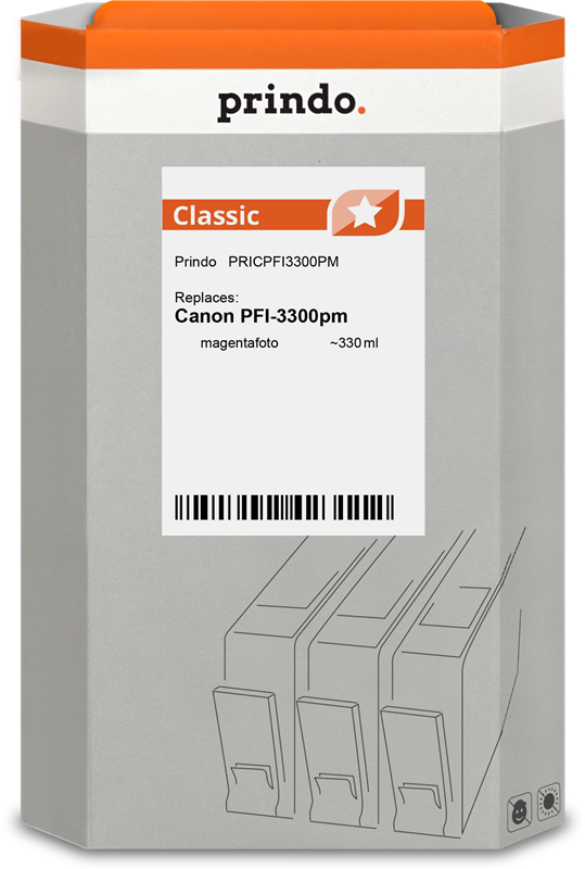 Prindo Classic magentafoto ink cartridge (PRICPFI3300PM) ink cartridge magentafoto 330ml €116.49VAT incl., free shipping directly from stock Delivery time 1-2 days add to basket Prindo Classic Black (photo) 330ml €116.49 Prindo Classic cyan 330ml €116.49 Prindo Classic magenta 330ml €116.49 Prindo Classic yellow 330ml €116.49 Prindo Classic Gray 330ml €116.49 Prindo Classic Red 330ml €116.49 Prindo Classic Blue 330ml €116.49 Prindo Classic cyanfoto 330ml €116.49 Prindo Classic magentafoto 330ml €116.49 Prindo Classic 330ml €116.49 Prindo Classic clear 330ml €116.49 Graduated pricesfrom 1 pcs.€116.49VAT incl.from 2 pcs.€110.66VAT incl.from 4 pcs.€104.84VAT incl.from 6 pcs.€99.02VAT incl. Product information "Prindo Classic magentafoto ink cartridge PRICPFI3300PM"ink cartridge magentafoto 330ml Prindo Promise: Top quality for a fair price, that is what our exclusive private label product line stand for Remanufactured original toners and cartridges, working parts changes and only highest quality of colors and materials Only selected partners and suppliers 5 years guarantee on Prindo products – no loss of warranty for your printer Read moreread lessSuitable for the following printersCanon imagePROGRAF (iPF)imagePROGRAF GP-2600SimagePROGRAF GP-4600SimagePROGRAF GP-6600SimagePROGRAF PRO-2600imagePROGRAF PRO-4600imagePROGRAF PRO-6600Manufacturer information on product safety (GPSR)Media-Concept Bürobedarf GmbH Inselkammerstrasse 582008 Unterhaching E-mail: mail@prindo.ie Website: www.prindo.ie Suitable accessories for your printer Price / performance winner Prindo Classic XL Black (photo) ink cartridgecolourTape Width Size colour: Filling quantity:700ml€223.40VAT incl., free shipping directly from stock add to basket directly from stock add to basket directly from stock add to basket directly from stock add to basket directly from stock add to basket directly from stock add to basket directly from stock add to basket directly from stock add to basket directly from stock add to basket directly from stock add to basket directly from stock add to basket Our price / performance winners Compatible Prindo Classic Ink cartridge for your printer.✅ Level indicator ✅ More printing performance ✅ 5-year warranty ✅ No loss of warranty for your printer Prindo Classic XL Black (photo) ink cartridgecolourTape Width Size:XL colour: Filling quantity:700ml€223.40VAT incl., free shipping directly from stock add to basket Prindo Classic XL Blue ink cartridgecolourTape Width Size:XL colour: Filling quantity:700ml€223.40VAT incl., free shipping directly from stock add to basket Prindo Classic XL cyan ink cartridgecolourTape Width Size:XL colour: Filling quantity:700ml€223.40VAT incl., free shipping directly from stock add to basket Prindo Classic XL cyanfoto ink cartridgecolourTape Width Size:XL colour: Filling quantity:700ml€223.40VAT incl., free shipping directly from stock add to basket Prindo Classic XL ink cartridgecolourTape Width Size:XL colour: Filling quantity:700ml€223.40VAT incl., free shipping directly from stock add to basket Prindo Classic XL Gray ink cartridgecolourTape Width Size:XL colour: Filling quantity:700ml€223.40VAT incl., free shipping directly from stock add to basket Prindo Classic XL magenta ink cartridgecolourTape Width Size:XL colour: Filling quantity:700ml€223.40VAT incl., free shipping directly from stock add to basket Prindo Classic XL magentafoto ink cartridgecolourTape Width Size:XL colour: Filling quantity:700ml€223.40VAT incl., free shipping directly from stock add to basket Prindo Classic XL Red ink cartridgecolourTape Width Size:XL colour: Filling quantity:700ml€223.40VAT incl., free shipping directly from stock add to basket Prindo Classic XL clear ink cartridgecolourTape Width Size:XL colour: Filling quantity:700ml€223.40VAT incl., free shipping directly from stock add to basket Prindo Classic XL yellow ink cartridgecolourTape Width Size:XL colour: Filling quantity:700ml€223.40VAT incl., free shipping directly from stock add to basket Your product is right in your shopping cart! Select your printer to make sure the selected product fits for you.Loading...